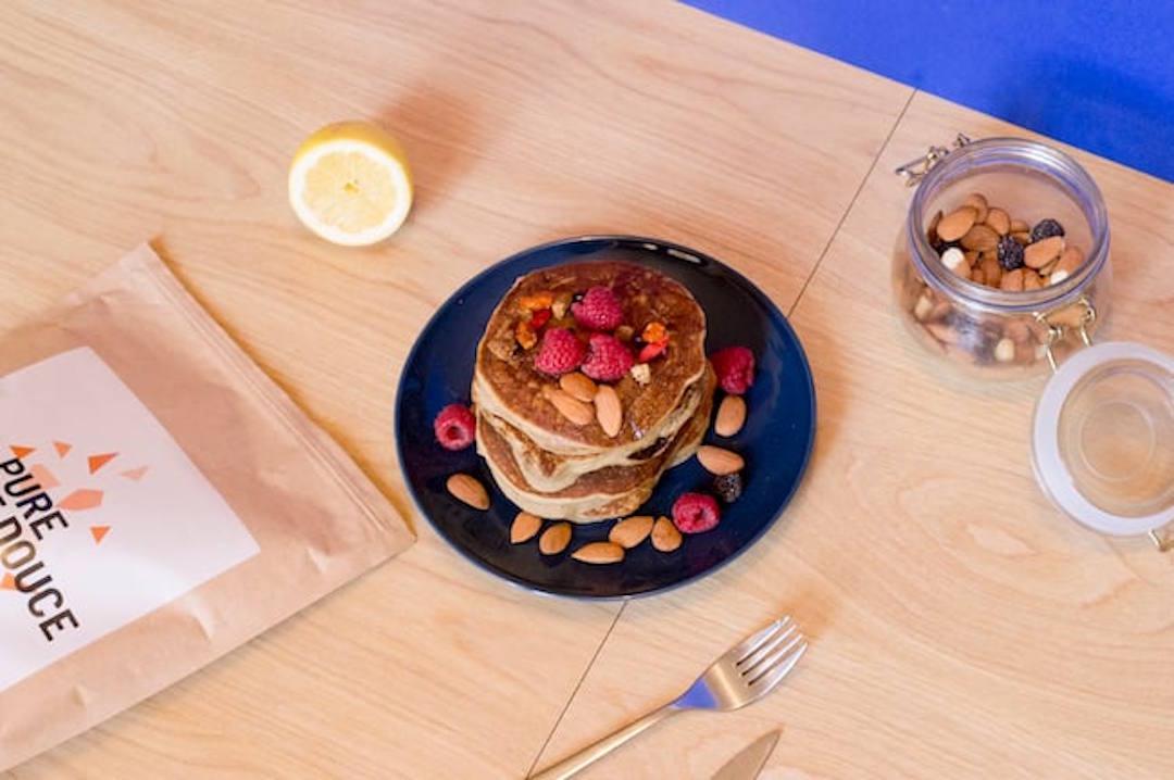 - Crêpes : 2 œufs bio, 15g de whey, 50g de poudre de patate douce, 150 ml de lait végétal.