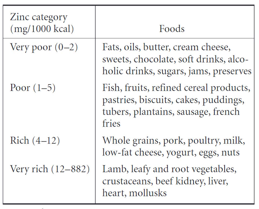 Cependant, non seulement il est présent en petites quantités, mais en plus, toutes les sources alimentaires de zinc ne se valent pas. C’est la raison pour laquelle une étude a essayé de classer les aliments contenant du zinc en 4 catégories selon leur potentiel à servir ou non de source de zinc dans l'alimentation :