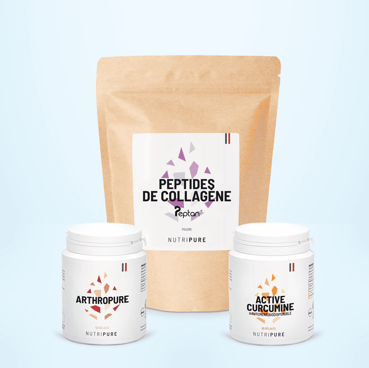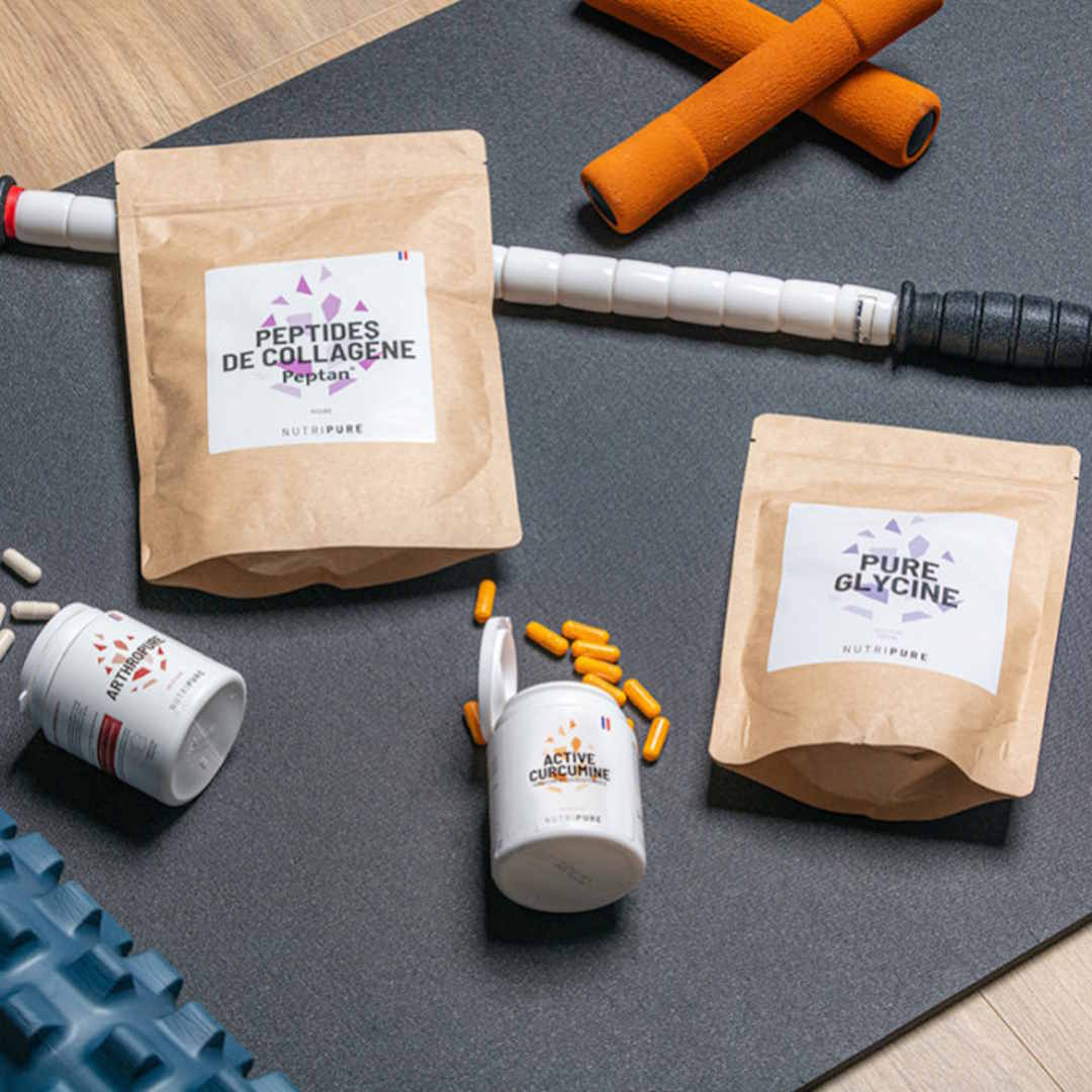 Il existe également quelques compléments alimentaires qui peuvent soit vous aider à diminuer les douleurs et lutter contre l’inflammation (Active Curcumine et Oméga 3) soit aider votre corps à reconstruire les articulations (Arthropure, Peptides de Collagène et Glycine).