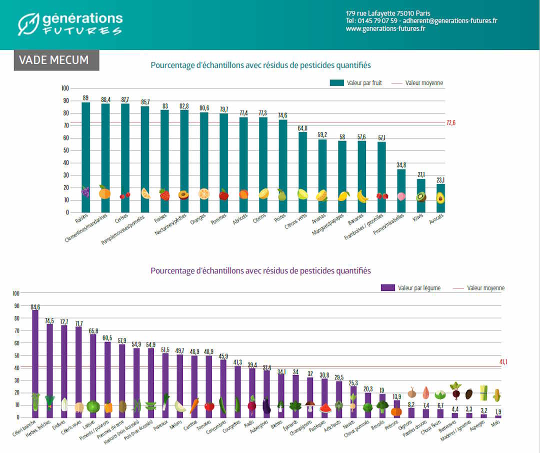 - Choisir des fruits et légumes biologiques le plus souvent et dans tous les cas obligatoirement dans la liste suivante car ce sont ceux présentant les niveaux de pesticides les plus importants et parfois plusieurs pesticides différents comme le présente cette analyse de l’ONG Génération future fondée sur la base de données officielles produites par la Direction générale de la répression des fraudes (DGCCRF) sur une période allant de 2012 à 2016.