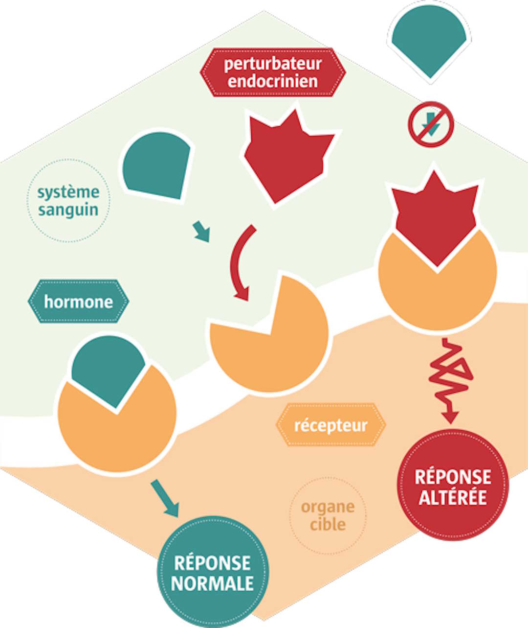 Cet impact négatif global dans l’organisme est lié au fait que les perturbateurs endocriniens se comportent comme des « usurpateurs hormonaux » en se fixant sur les récepteurs de nos hormones à la surface de nos cellules ce qui impacte le corps selon des mécanismes complexes.