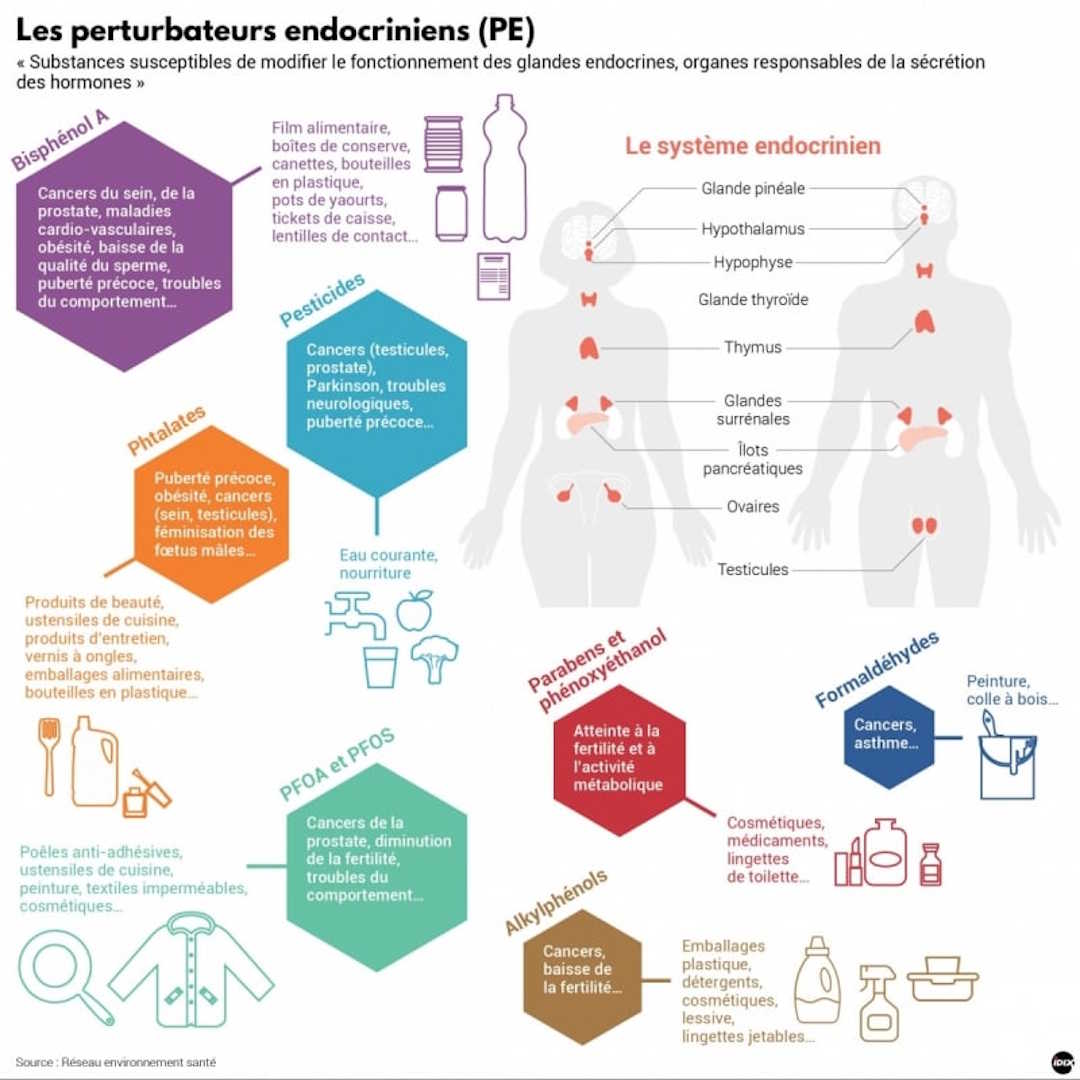 On les trouve dans l'alimentation (pesticides, bisphenol A et B, phtalates, DINCH, certains additifs alimentaires, revêtements antiadhésifs, … ).