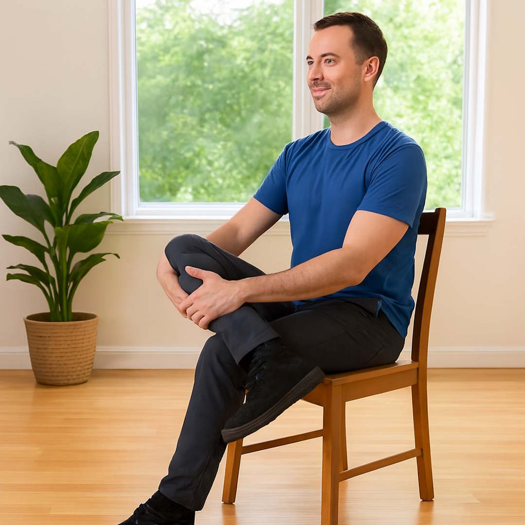 - Assis sur chaise : posture « jambe croisée » pendant 20 à 30 secondes de chaque côté.