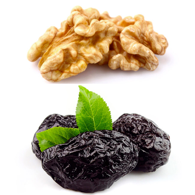 Les noix contiennent des taux importants d’acides gras oméga 3 sous formes végétales (acides alpha linoléniques ), ainsi que des antioxydants, des fibres, des polyphénols et sont riches en magnésium et en zinc. Les pruneaux en plus de leur teneur importante en fibres sont fortement basifiants et contiennent plus de 41 polyphénolsdifférents. une seule barre protéinée.