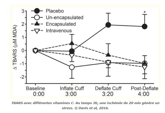 Cette observation a été faite en mesurant le TBARS, qui représente le taux de radicaux libres et permet donc de quantifier le stress oxydatif. Les observations montrent que la forme liposomale n’a pas plus d’efficacité que l’acide ascorbique classique.