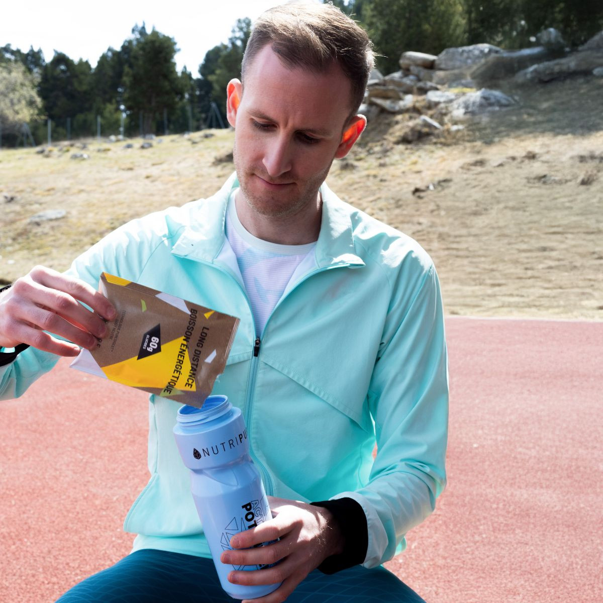 Consommer la boisson énergétique 60g durant un effort supérieur à 1h30 par petites gorgées régulières.