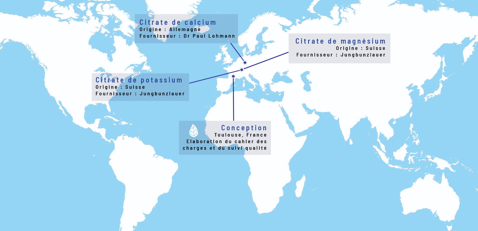 Sucre de canne, citrate de potassium, citrate de calcium, citrate de magnésium, sel de mer non raffiné, citrate de sodium, arôme naturel de citron, gluconate de zinc, vitamine C (acide ascorbique), vitamine B2 (riboflavine), vitamine B1 (chlorhydrate de thiamine).