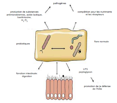 Figure 1 : mécanismes des interactions entre le microbiote intestinal commensal et les probiotiques.