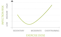 En gagnant en intensité, l’exercice peut être une source de stress physiologique et psychologique et les défenses naturelles de l’organisme peuvent être altérées. La relation entre l’intensité de l’exercice et l’immunité est une courbe en forme de J. Il semble que les personnes soient plus sujettes aux infections bactériennes et virales après un entraînement intense, ce phénomène peut durer jusqu’à 72 heures. L’immunité réduite, associée à l’hyperventilation qui se produit naturellement pendant l’exercice, contribuent à une plus grande susceptibilité aux troubles des voies respiratoires supérieures chez les sportifs. Les infections sont une cause fréquente d’annulation d’entraînement et même de compétition et peuvent affecter les performances des sportifs.