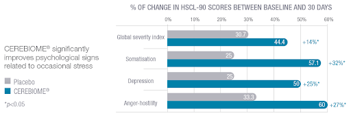 Messaoudi 2010 : La première étude qui a démontré l'impact positif d'un probiotique sur le stress occasionnel chez l'homme sain. Cette étude de référence (randomisée, contrôlée contre placebo et en double aveugle) a été menée sur 55 volontaires sains (30 à 60 ans) pour la prise de CEREBIOME® ou d'un placebo. Après 30 jours de prise, une réduction significative du stress psychologique évaluée par les tests HSCL-90 (questionnaire validé) a été mise en évidence dans le groupe CEREBIOME®. Ces résultats étaient corrélés à la diminution significative du cortisol, un biomarqueur du stress. Chez les sujets moins stressés, une amélioration significative du score PSS, des scores HADS et du score d'anxiété/dépression dans le HSCL a été démontrée dans une étude post-hoc. (37)
