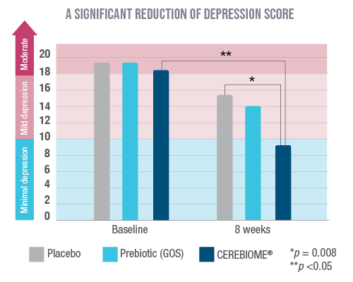 Rominj 2017 : participants déprimés sans traitement continu. Il s'agissait de la première étude menée avec CEREBIOME® sur des participants déprimés. Cette étude de référence a démontré que CEREBIOME® réduisait significativement la sécheresse buccale et les troubles du sommeil (p<0,05) par rapport au groupe placebo. (38)