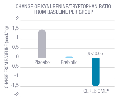 Kazemi 2018 : Participants déprimés avec traitement en cours (depuis au moins 3 mois). Cette étude randomisée, en double aveugle et contrôlée par placebo a inclus 110 patients souffrant de dépression légère à modérée et recevant un traitement antidépresseur. Le probiotique a été utilisé comme traitement d'appoint au traitement antidépresseur conventionnel et a montré une diminution significative des scores de Beck Depression Inventory (BDI), de 18 à 9 en moyenne (figure 5). Ces résultats sont cliniquement significatifs, montrant que les patients, après traitement par CEREBIOME®, étaient désormais classés en « dépression minimale » selon l'échelle d'évaluation validée. De plus, le groupe CEREBIOME® a montré une diminution du rapport kynurénine/tryptophane sanguin, ce qui suggère que le tryptophane a été détourné vers la synthèse de la sérotonine et loin de la voie inflammatoire (figure 4). (39)