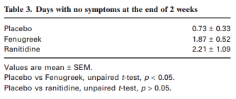L'amélioration pour chacune des 2 semaines a été jugée par comparaison avec les résultats d'une semaine de référence. Les effets du produit à base de fibres de fenugrec étaient significativement différents de ceux du placebo, avec des scores moins élevés, soit moins de symptômes. De plus, les effets des fibres de fenugrec étaient généralement similaires aux résultats produits par un médicament antiacide en vente libre (ranitidine à 75 mg, deux fois par jour). Cette étude suggère que les personnes souffrant de certains degrés de brûlures d'estomac peuvent bénéficier d'un produit à base de fibres de fenugrec.