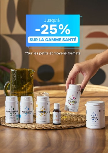 *Offre Spéciale Santé : Profite de réductions allant jusqu'à -25% sur les formats 1 et 3 mois (petits et moyens formats) de notre gamme Santé. Offre cumulable avec les autres offres en cours, valable du 28/10/25 au 11/11/25 dans la limite des stocks disponibles.