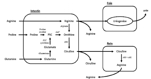 Ainsi, la citrulline formée par l’intestin est exportée dans la veine porte, et peut être captée par les reins afin d’être utilisée dans pour la synthèse d’arginine. L’arginine est l’un des 20 acides aminés qui composent nos protéines. Elle joue un rôle dans la division cellulaire, la guérison des blessures, l'élimination de l'ammoniaque par l'organisme, le bon fonctionnement du système immunitaire et la sécrétion de certaines hormones. (5)