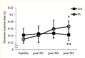 Les performances de temps de réaction prémotrice ont été maintenus dans le groupe AA, tandis qu’ils ont été altérés dans le groupe PL, ce qui a entraîné une performance significativement meilleure des sujets du groupe AA. (figure 12)
