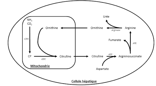 La citrulline est également connue pour être un intermédiaire du cycle de l’urée (figure 4) dans l’hépatocyte, au niveau du foie. Cela permet d’épurer l’excès d’azote dans l’organisme, notamment en situation d'hyperammoniémie (excès d’ammoniac dans le sang, qui peut être très toxique).