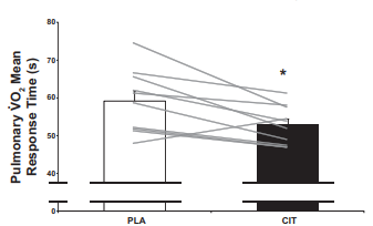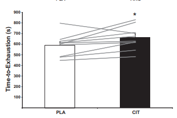 Bailey et al. (13) ont démontré que la complémentation en citrulline (6 g/jour) pendant 7 semaines améliorait la durée d’effort jusqu’à épuisement de 12% lors d’un test de performance à haute intensité sur vélo. Ce résultat sur la performance pourrait être lié à la plus faible VO2 moyenne observée ou à la diminution de la pression artérielle avec la complémentation en citrulline.