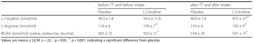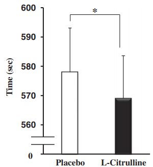 (14) Suzuki T, Morita M, Kobayashi Y, Kamimura A. 2016. Oral L-citrulline supplementation enhances cycling time trial performance in healthy trained men: Double-blind randomized placebo-controlled 2-way crossover study. J Int Soc Sports Nutr. 13:6.