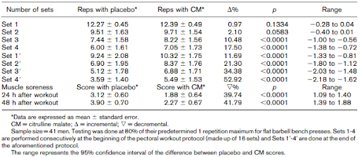 Une troisième étude a testé la supplémentation en citrulline sur la performance en musculation. (16) Les sujets ont reçu sur deux périodes une supplémentation en citrulline de 8g par jour et un placebo, sur deux périodes différentes et les résultats ont été comparés. Une augmentation significative de la capacité de travail a été observée, avec une supplémentation lors de répétitions de séries de soulevés de poids. Les sujets supplémentés en citrulline avaient une capacité de répétitions au développé couché 52,92% plus élevée par rapport au groupe placebo, à 80% de charge maximale préalablement déterminée. Aussi, une réduction globale des courbatures a été observée chez les participants supplémentés en citrulline (figure 9).