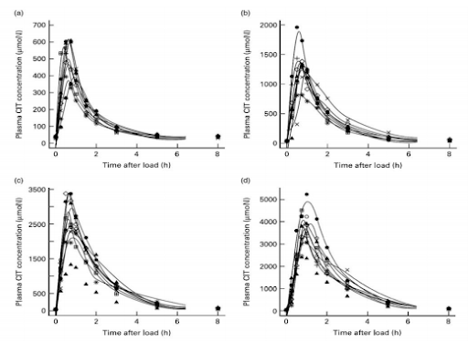 La pharmacocinétique de la citrulline a été déterminée au cours de différentes études cliniques. Chez des volontaires sains, Moinard et al. (19) ont démontré qu’après ingestion de citrulline à différentes doses, les concentrations plasmatiques en citrulline et en arginine augmentent rapidement et de façon proportionnelle à la dose de citrulline ingérée, puis retournent aux valeurs de base après 5 à 8h en fonction de la dose (figure 10).