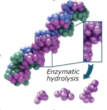 Utilisé depuis longtemps, notamment dans l’industrie agroalimentaire, le collagène natif est difficilement absorbé par la barrière intestinale. Pour pallier ce défaut, on effectue une « découpe » des molécules de collagène appelée hydrolyse. L’hydrolyse permet d’obtenir des petits segments protidiques de faible poids moléculaire appelés « peptides » assimilable(s) au niveau du tractus gastro-intestinal et disponible(s) pour notre organisme.