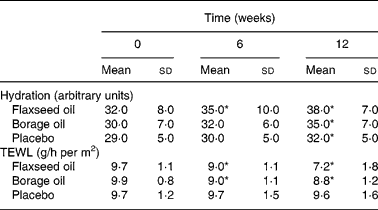 Enfin, l’hydratation de la peau ainsi que la perte d’eau transépidermique et la structure de la peau ont été étudiées. Chez les femmes supplémentées en huile de lin ou de bourrache, l'hydratation de la peau était significativement augmentée après 12 semaines de traitement par rapport au jour 0. Le TEWL a diminué dans les deux groupes d'huile végétale d'environ 10 % après 6 semaines. Aucune différence statistiquement significative entre le jour 0 et les semaines 6 et 12 n'a été mesurée dans le groupe placebo (figure 11).