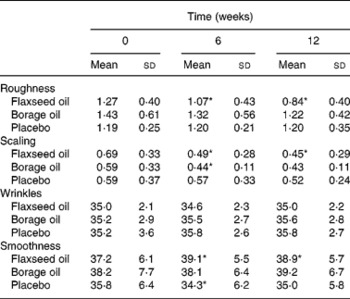 Les profils cutanés ont été analysés à l'aide de la méthode d'évaluation de la surface de la peau vivante qui fournit des paramètres associés à la rugosité, la desquamation, la douceur et les rides de la peau. Après une intervention de 12 semaines avec de l'huile de lin, la rugosité, la desquamation et la douceur ont été améliorées (figure 12). La supplémentation en huile de bourrache a entraîné des modifications des mêmes paramètres, mais seule la diminution de la desquamation de la semaine 0 à la semaine 6 était statistiquement significative. Aucun changement n'a été déterminé dans le groupe placebo, à l'exception d'une diminution faible mais statistiquement significative de la régularité des paramètres. Aucun des traitements n'a affecté les rides.