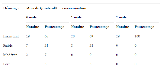 Figure 6 : Fréquences de 29 personnes âgées indiquant des démangeaisons comme inexistantes, faibles, modérées ou fortes avant et après 1 et 2 mois de consommation d'huile de bourrache