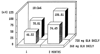 Également, la consommation d'huile de bourrache entraîne des modifications très importantes de la composition en acides gras phospholipidiques membranaires. Comme le montre la figure 7, la prise de 1,5 g d'huile de bourrache par jour pendant 2 mois a entraîné une augmentation relative de GLA membranaire d'environ 70 %, similaire à l'effet d'un supplément de 3 g pendant 1 mois (+74 %).