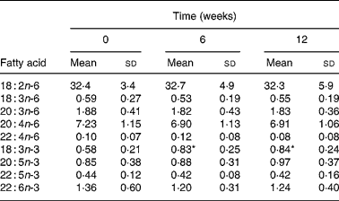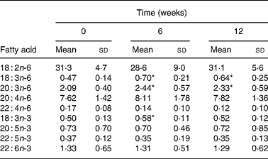 Résultats obtenus : dans un premier temps, les auteurs ont comparé les acides gras apportés par les différentes huiles chez les deux groupes. Dans le groupe de l'huile de lin, seule la contribution de l'ALA (acide alpha-linolénique, oméga 3) aux acides gras totaux a été significativement modifiée. Du jour 0 à la semaine 6, il a augmenté de 0,58 à 0,83 % et est resté constant jusqu'à la semaine 12 (figure 8). Lors de la supplémentation en huile de bourrache, la quantité relative de GLA a été significativement augmentée aux semaines 6 et 12 par rapport au jour 0 (figure 9). Une augmentation a été détectable pour l'acide di-homo-γ-linolénique (DGLA, le métabolite du GLA) de 2,09 % à la semaine 0 à 2,44 % à la semaine 6 et à 2,33 % à la semaine 12.