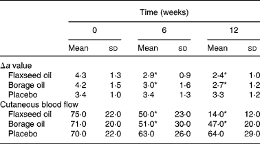En plus de cette valeur Δ, le flux sanguin cutané a été mesuré. En effet, lors d’une inflammation, le flux sanguin cutané augmente (ce qui est en partie responsable des rougeurs également). Le flux sanguin cutané, par rapport à la ligne de base, était plus faible dans les groupes recevant de l'huile de lin et de bourrache après 6 et 12 semaines de supplémentation (figure 10 ). Aucun changement n'a été observé dans le groupe placebo.