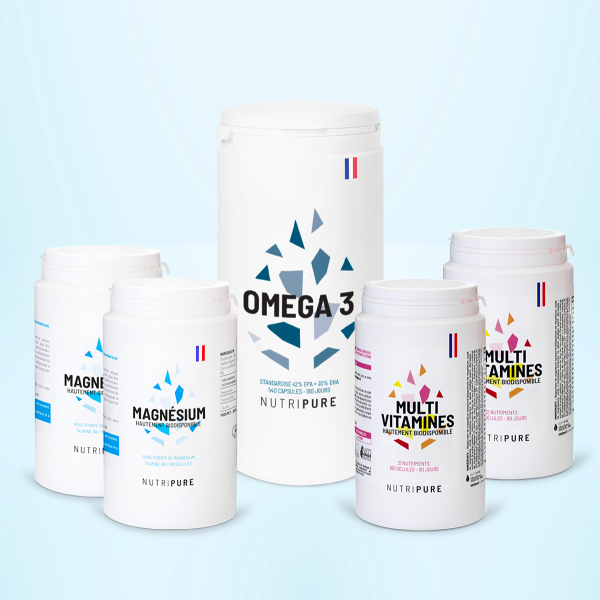 Notre magnésium est complémentaire au Multivitamines Nutripure. Associés, il vous apporteront 96% de vos apports de référence (dose maximale autorisée en France) en termes de magnésium ainsi qu’une disponibilité pour l’organisme lissée sur la journée.